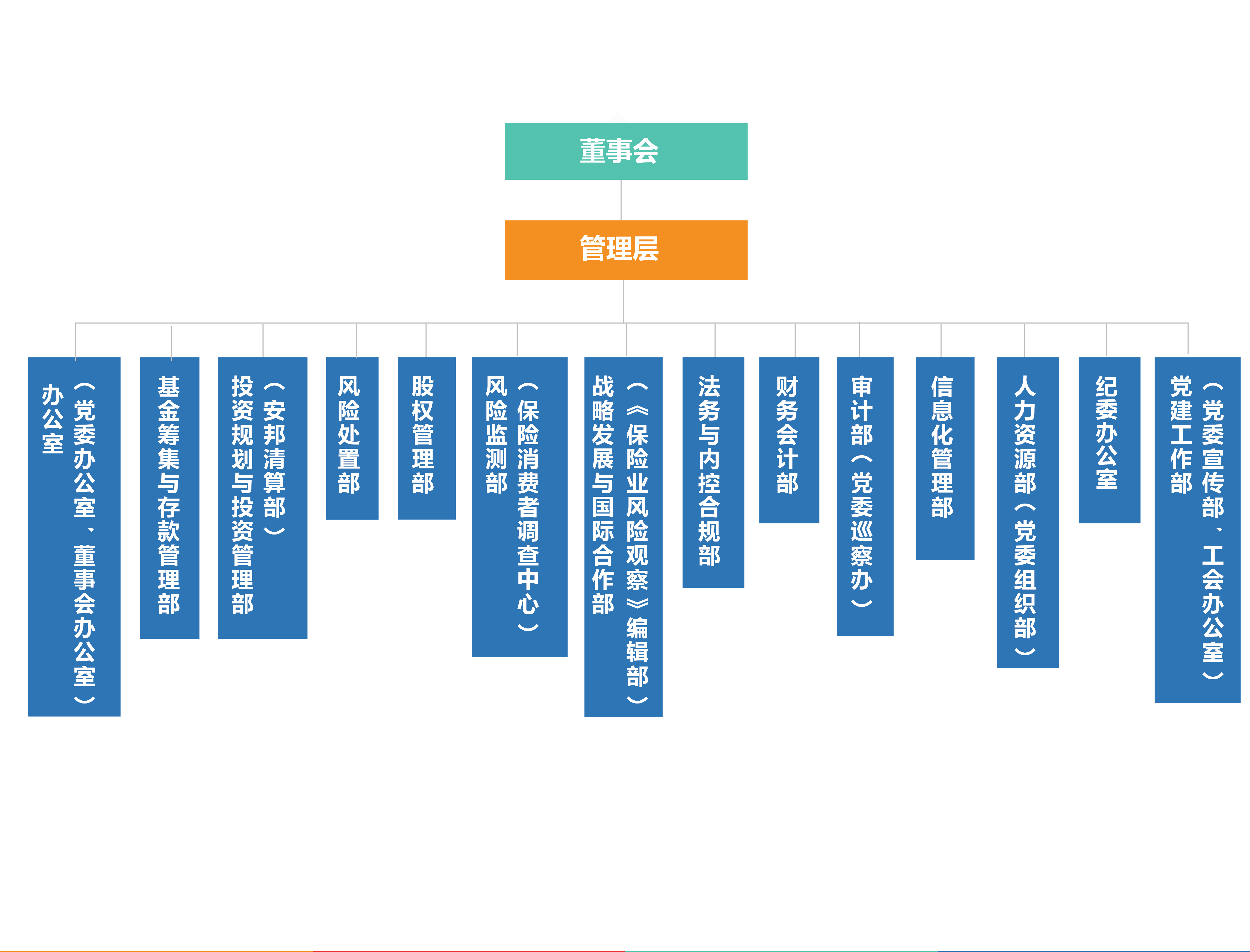??目前公司內(nèi)部機構(gòu)設(shè)置包括辦公室(黨委辦公室、董事會辦公室)、基金籌集與存款管理部、投資規(guī)劃與投資管理部(安邦清算部)、風(fēng)險處置部、股權(quán)管理部、風(fēng)險監(jiān)測部(保險消費者調(diào)查中心)、戰(zhàn)略發(fā)展與國際合作部(《保險業(yè)風(fēng)險觀察》編輯部)、法務(wù)與內(nèi)控合規(guī)部、財務(wù)會計部、審計部(黨委巡察辦)、信息化管理部、人力資源部(黨委組織部)、紀(jì)委辦公室、黨建工作部(黨委宣傳部、工會辦公室)共十四個部門。